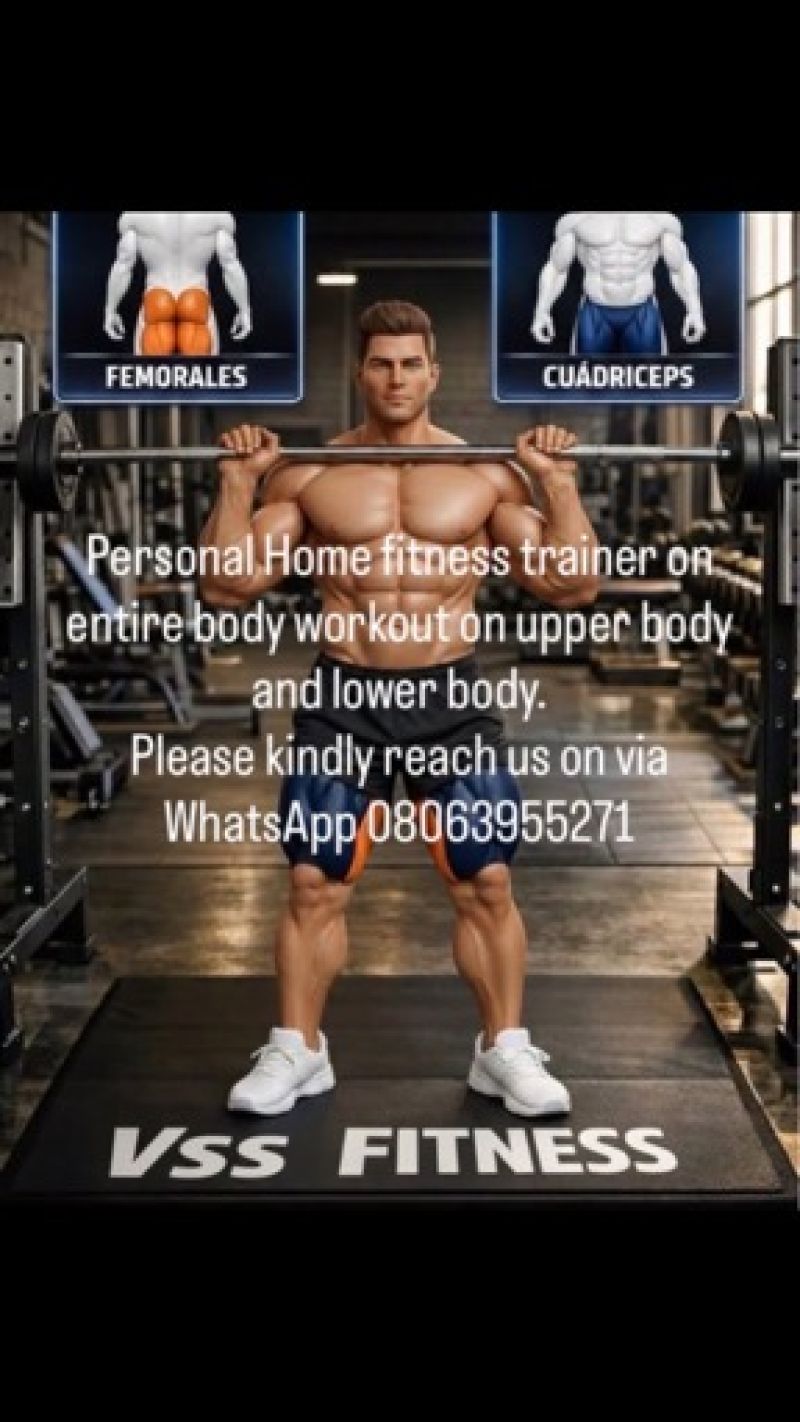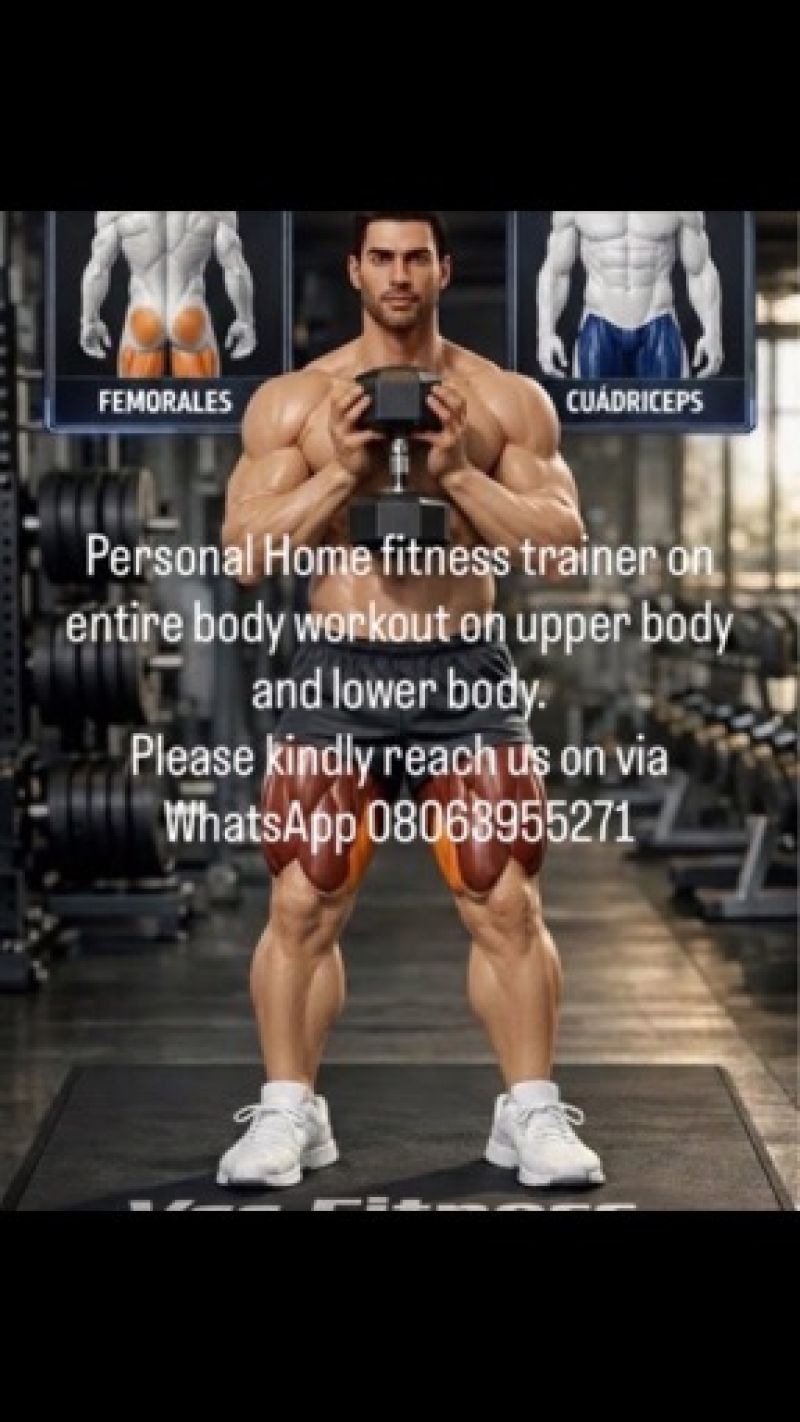 Personal Home fitness trainer on entire body workout on upper body and lower body.